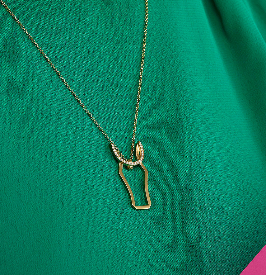From €380,00There is a wonderful pop of blue combined with the iconic gold horse head pendant....