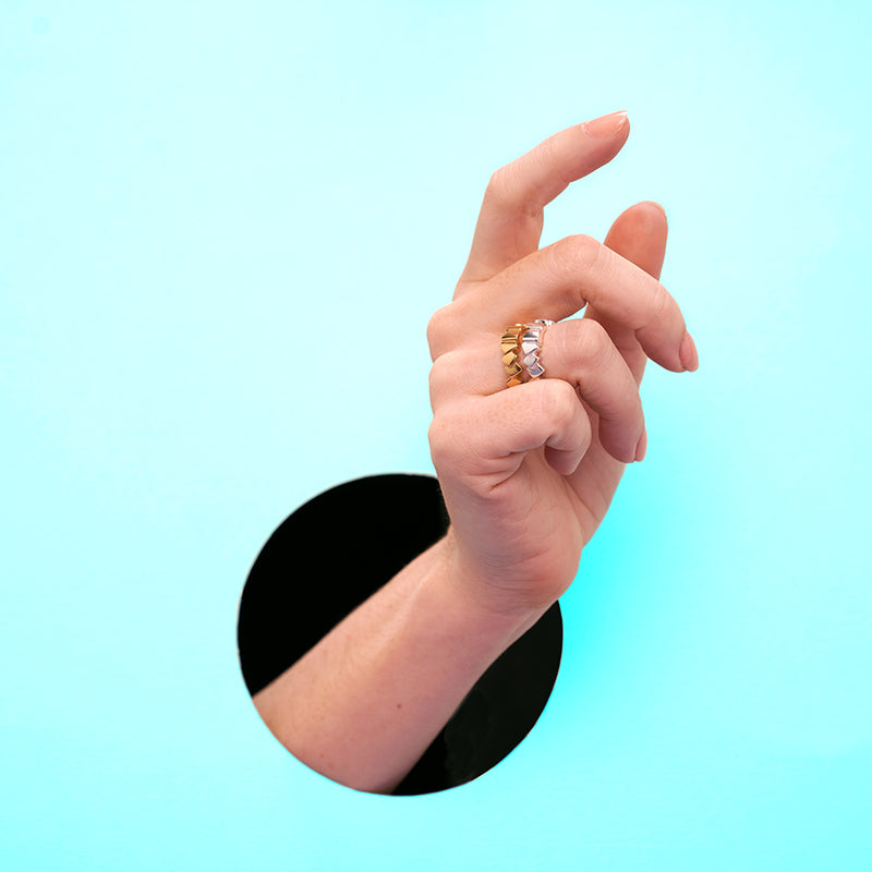 The extra cool thing about this collection is that it’s available in a number of precious metals with a variety of finishes. So if you’re feeling like a badass, you can chose the concrete finish. Or if you like a bit of subtle sparkle, the silver or gold high polish finish is for you. Checkout the Adversity collection for more.