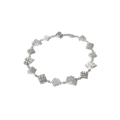 Handcrafted in sterling silver this piece measures 20 cm / 8 inches long and features alternating positive / negative spatial demi cubes each between 8mm and 10mm cubed. The precision of this dynamic motif is transformed into a captivating repeat pattern, amplifying the aesthetic rhythm and visual strength of the piece. To preserve the interior from oxidisation the copper allow present in all Sterling silver has been removed to minimise any tarnishing. The piece is hallmarked by the Irish Assay Office to confirm its authenticity where Vanessa is a registered Goldsmith there.