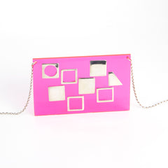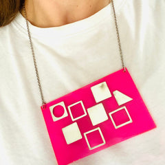 Discover your inner joy with this delightfully vibrant Pink and Silver Pendant Necklace. Hand-pierced alternative graphic silver shapes are combined with a transparent hot pink perspex design to make a bold and playful statement piece.