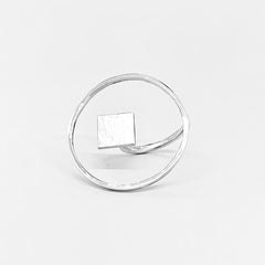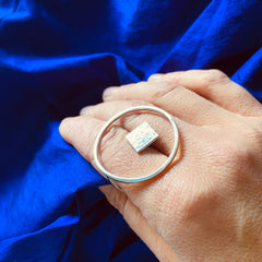 The Open Framed Square design ring is a unique hand statement. Hand made from sterling silver this piece reflects a minimalist aesthetic with maximum impact. The textured square is framed by a silver circle as if floating on the hand. A style secret for the person with keen architectural sensibility. The open ring design means this is easy to wear and can enhance the daytime outfit or embellish your style on a night out!