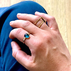 The richness of this London Blue Topaz set in 9ct gold makes this a beautiful yet easy to wear ring. The design features an abstract facetted gemstone delicately set in a contrastingly simple yet elegant gold band, allowing the stone space to be appreciated. The contrasting colours emanate a richness second to none.