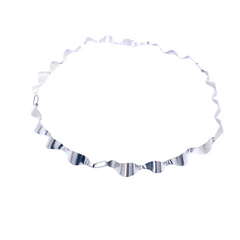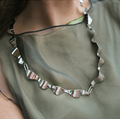Sitting across the breast bone this piece measures approximately 20inches in length. Each undulating wave form is connected to the next using an elongated chain link using a cold connection and S clasp to link both ends. There is a subtle movement in the piece to enhance the fluid water form of the design. Handmade in co. kildare Ireland this original contemporary design is created using traditional silversmithing techniques for a truly unqiue statement in contemporary design.